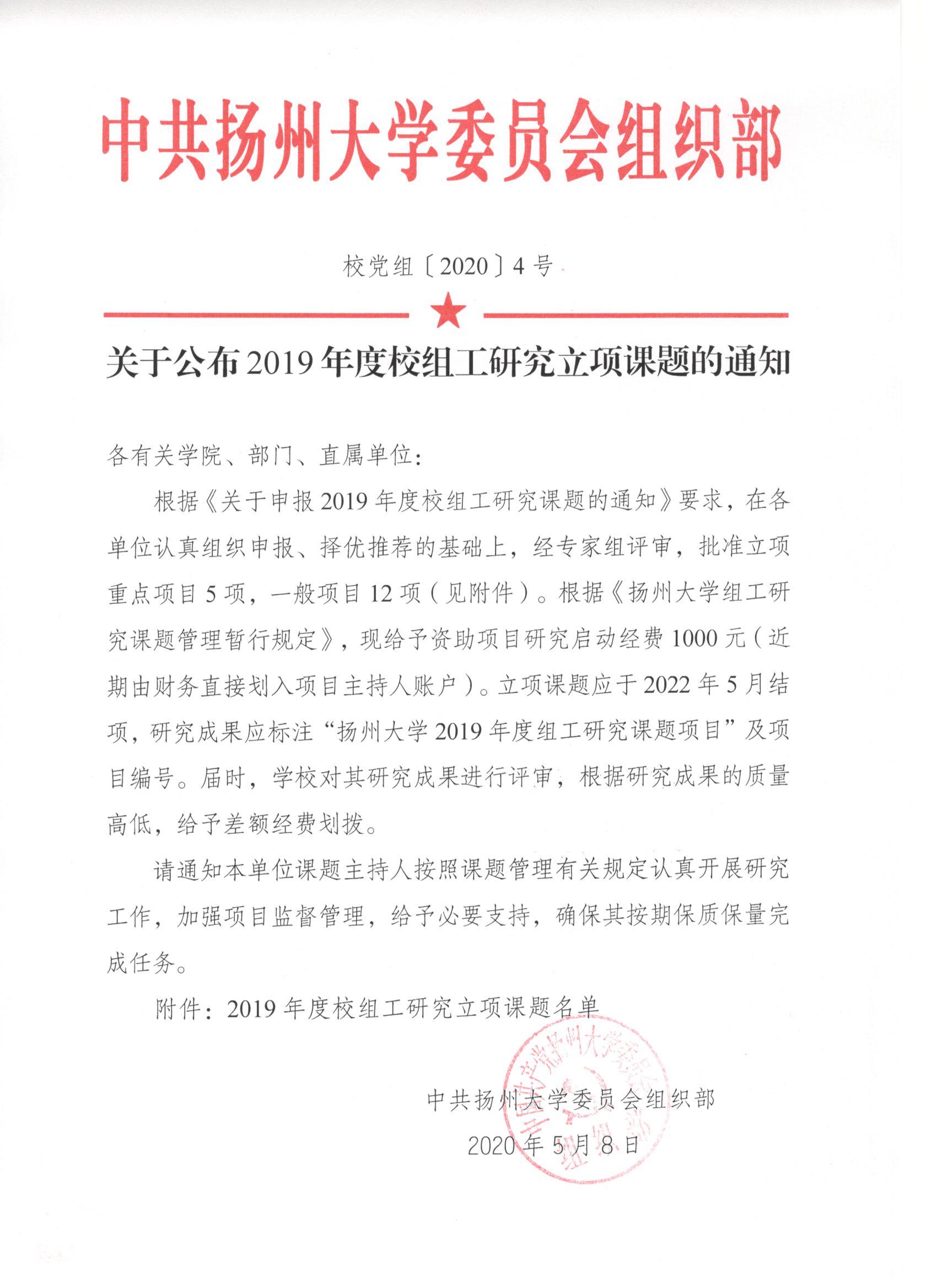 关于公布2019年度校组工研究立项课题的通知