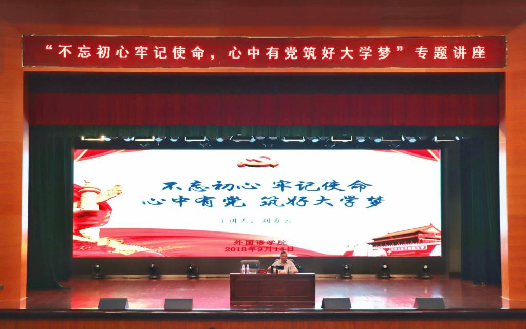 为向新生普及入党知识,增强学生对党的认同感与归属感,吸纳更多优秀人才,9月14日晚,外国语学院在文体馆举行第59期初级党校培训班暨新生入学教育活动,特邀校工委刘方云主任做“不忘初心牢记使命,心中有党筑好大学梦”专题讲座。院党委副书记崔益军、院团委书记刘芳玮出席,全体辅导员及18级本科生、研究生参加。