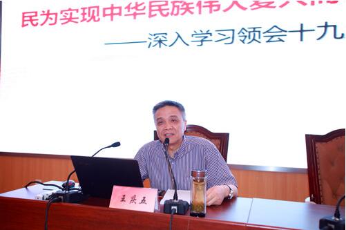 王庆五在题为《习近平新时代中国特色社会主义思想是全党全国人民为实现中华民族伟大复兴而奋斗的行动指南》的报告中,系统阐释了习近平新时代中国特色社会主义思想的重大意义、科学体系、丰富内涵和历史地位。