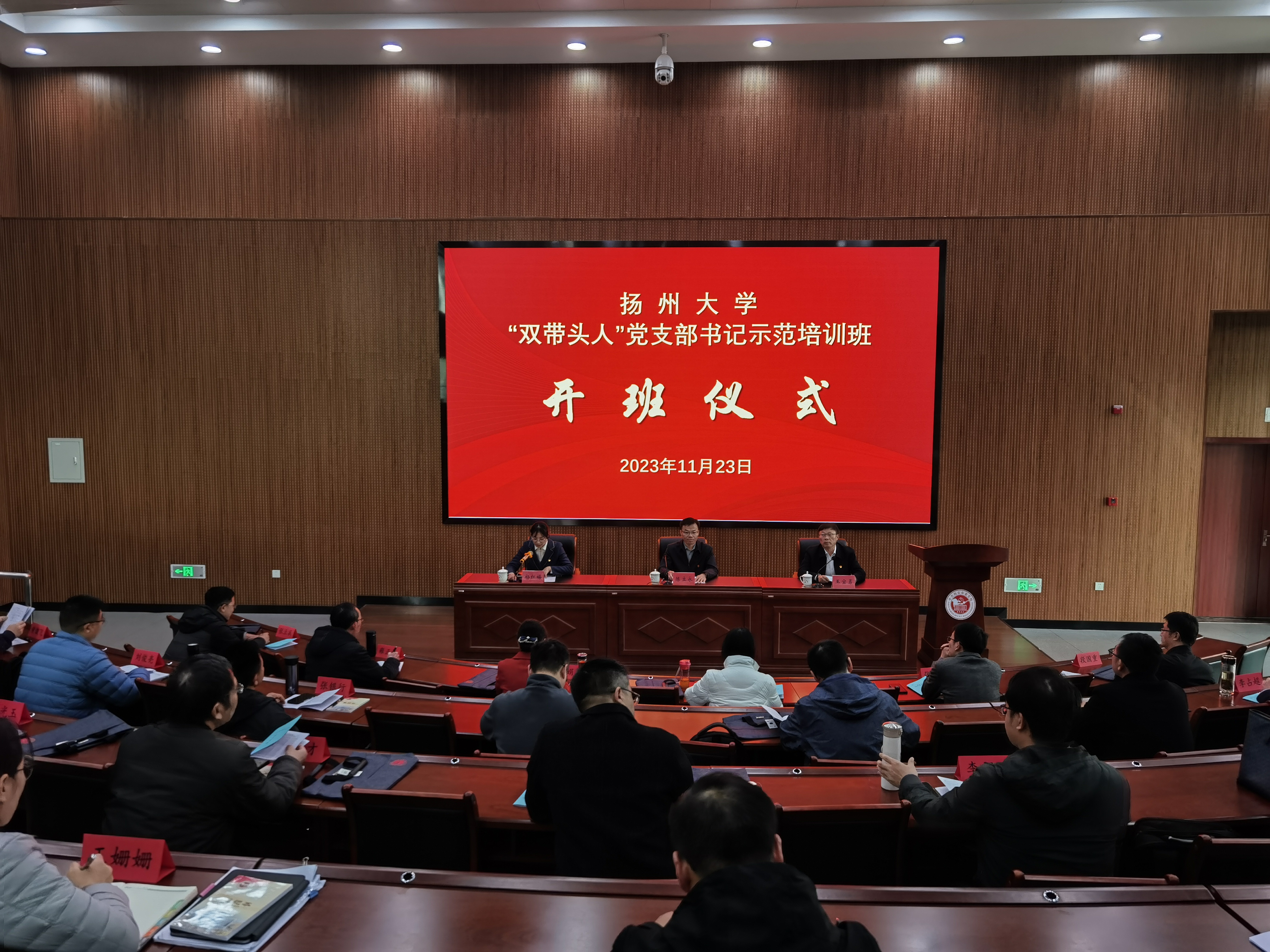 11月23日,培训班举行开班仪式,海安市委党校常务副校长王宝勇同志致辞,我校党校常务副校长兼党委组织部副部长陈立永作开班动员讲话。陈立永指出,学校党委一直高度重视“双带头人”书记队伍建设,实施了“双带头人”教师党支部书记培育工程,努力把教师党支部书记队伍打造成为推动新时代基层党组织党建和业务双融合双促进的中坚骨干力量。他希望,全体学员要珍惜本次培训教育机会,进一步提高政治站位,认清职责使命,强化担当作为。